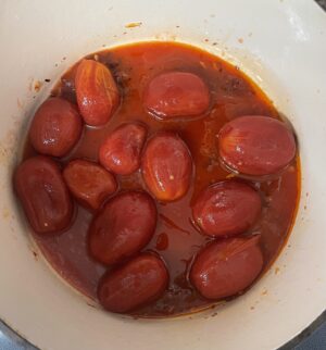 Add the whole peeled tomatoes to the saucepan. You will want to use the entire can, meaning the tomatoes and the liquid the tomatoes are sitting in.