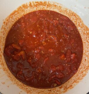 Once the tomatoes are in, use a masher, spatula, or whatever utensil you have handy, dice up the tomatoes to your desired thickness. Some prefer a chunkier sauce, while others prefer something smoother.*