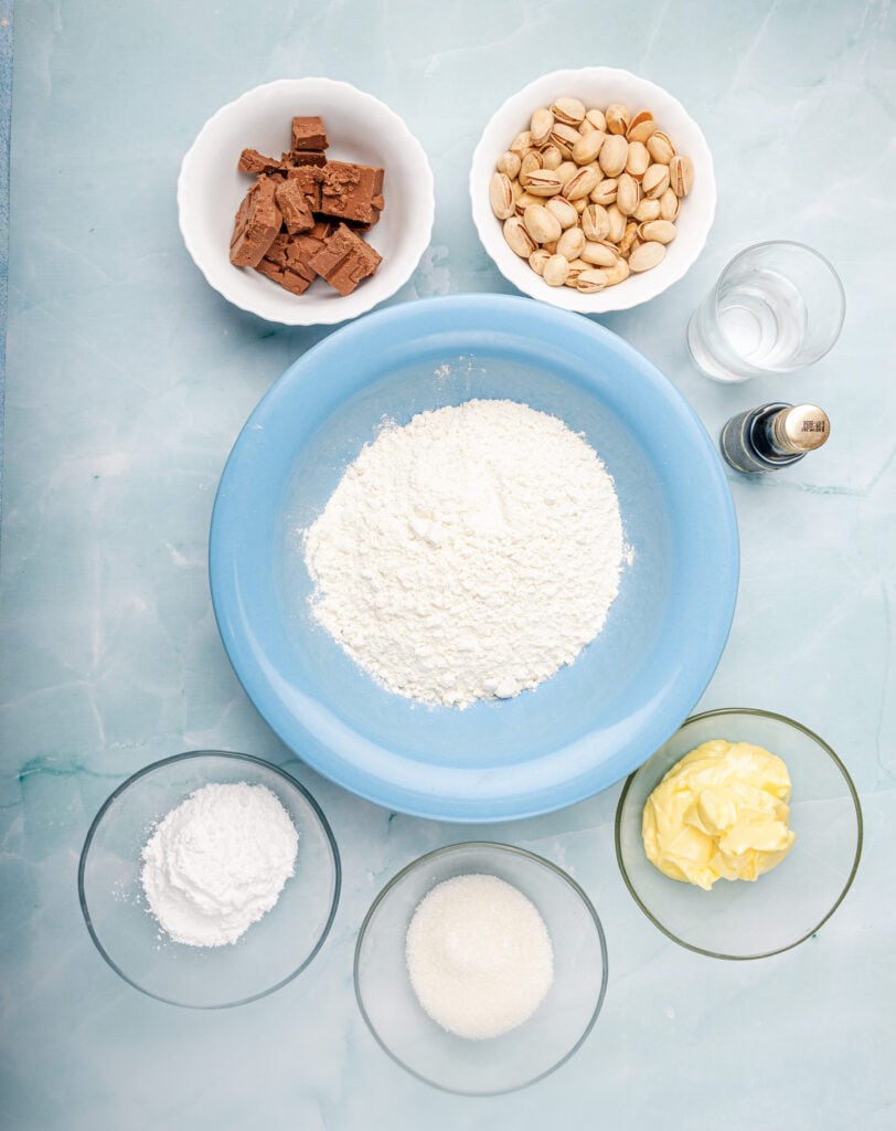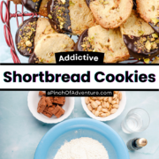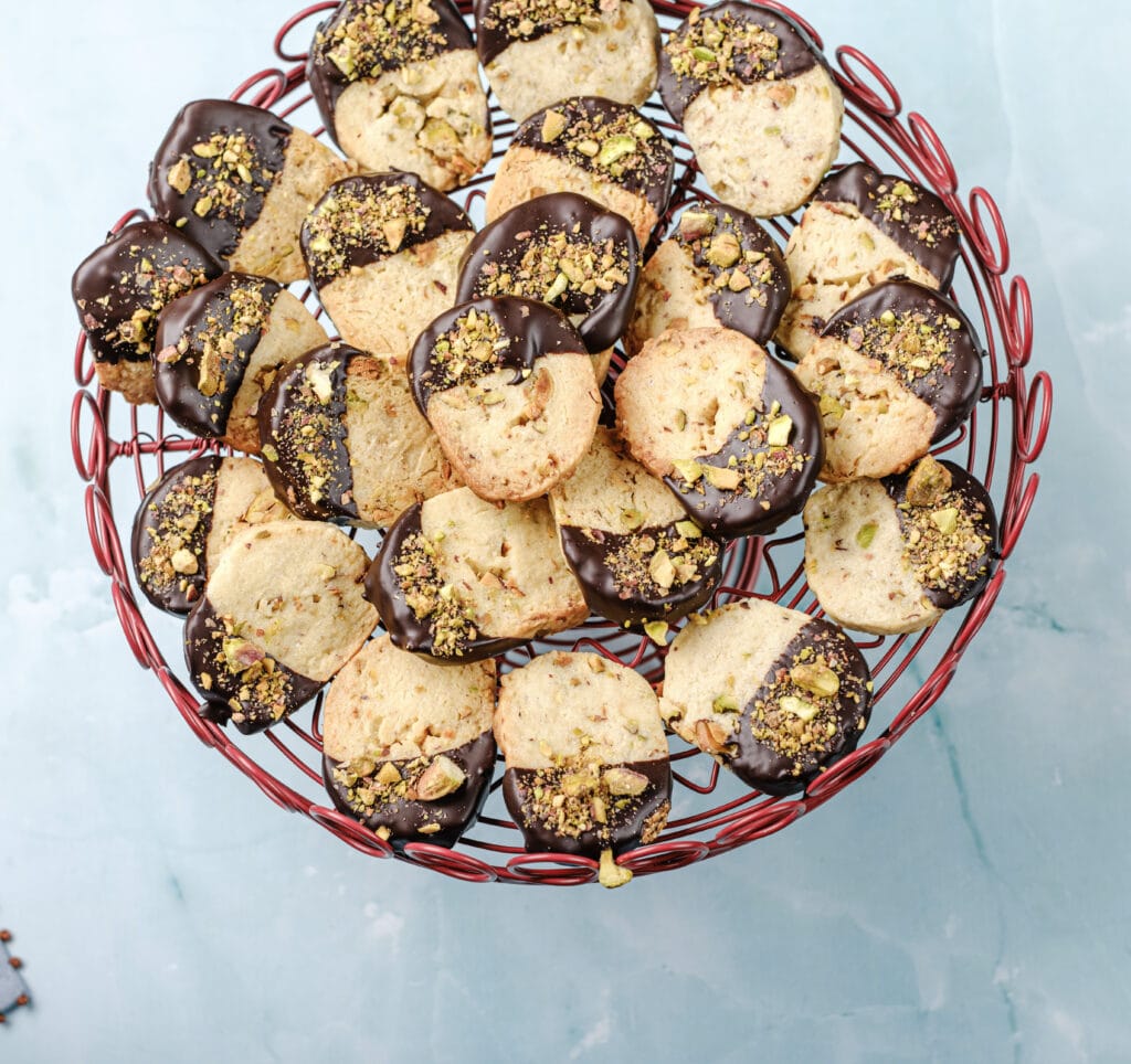 The two main ingredients that separate this recipe for shortbread cookies from the standard ho-hum shortbread recipes, are pistachio nuts and dark chocolate.