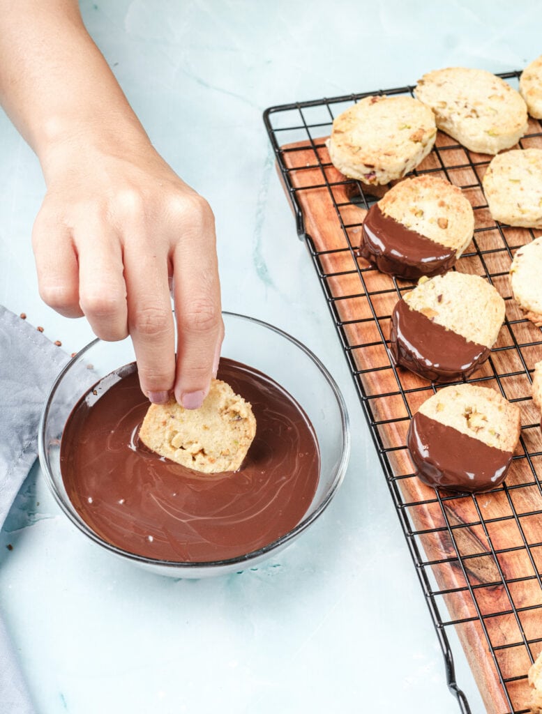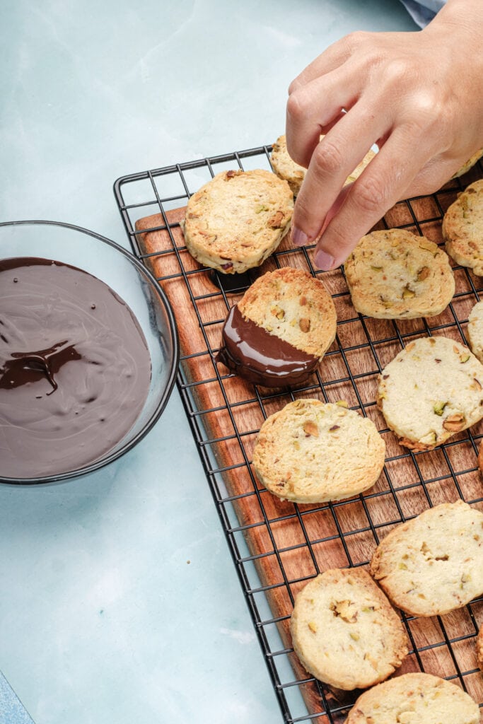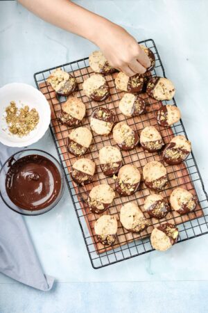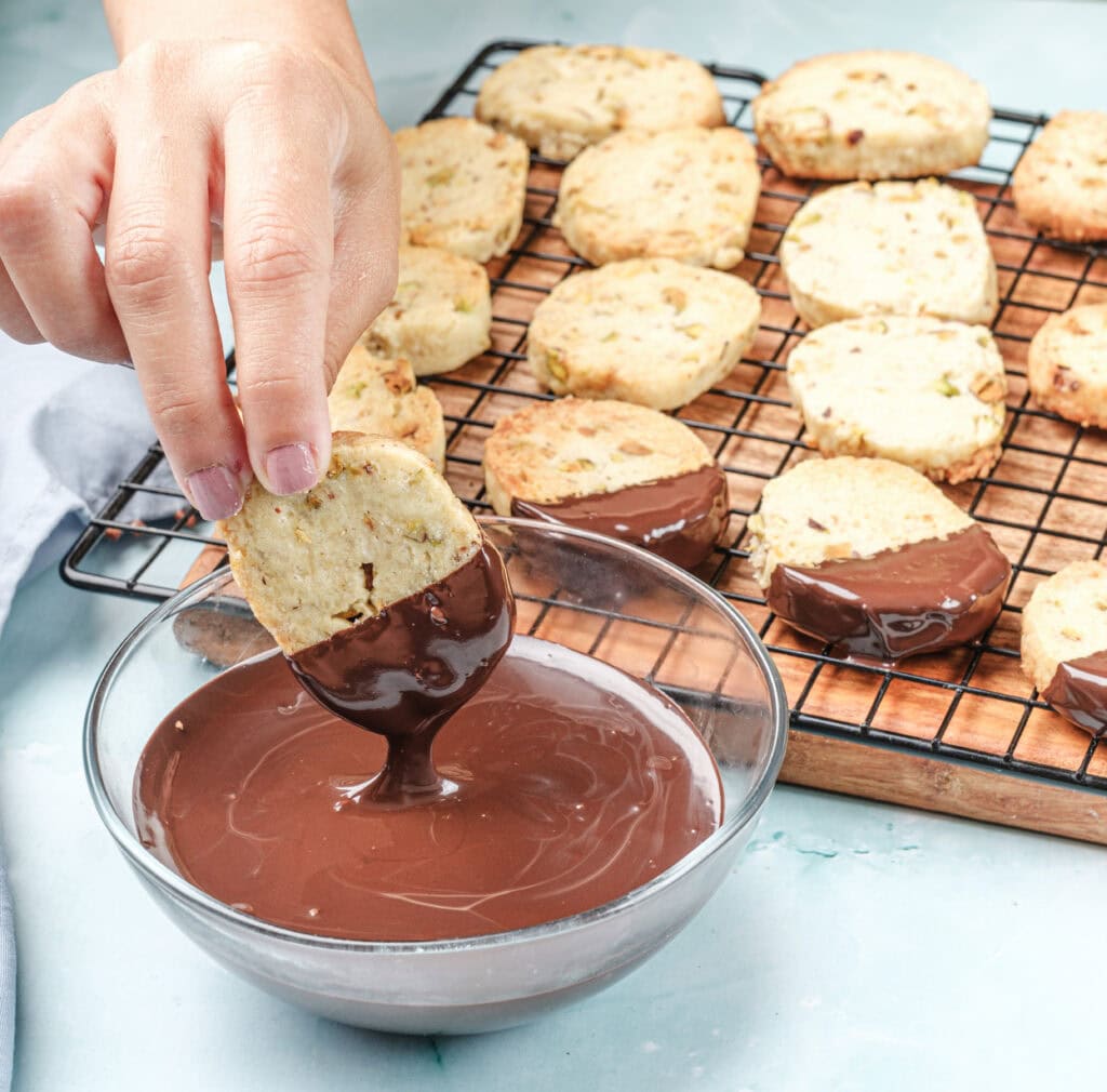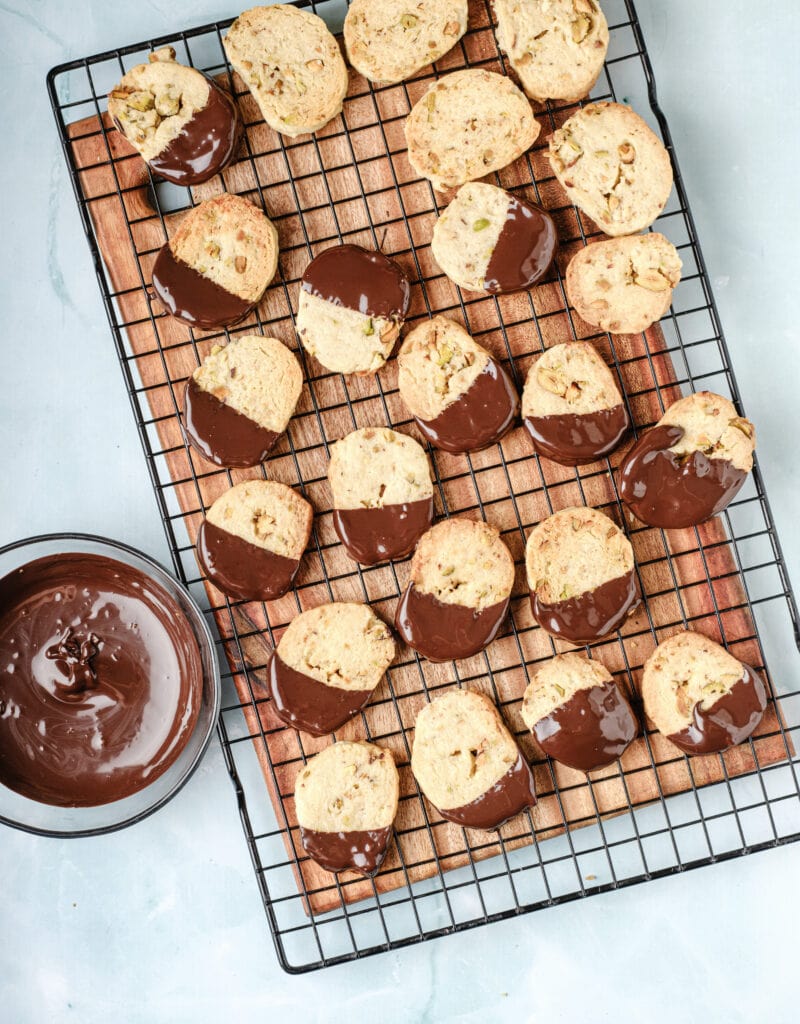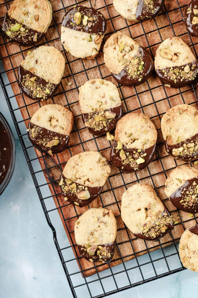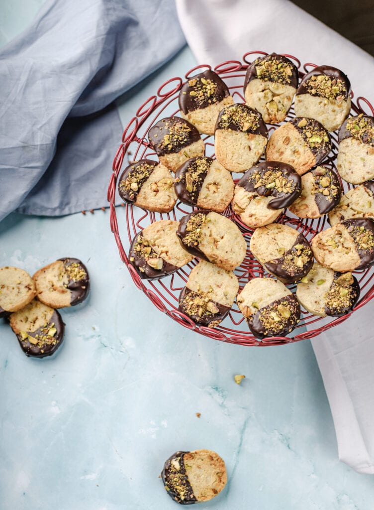There is something very decadent about these chocolate dipped pistachio shortbread cookies.