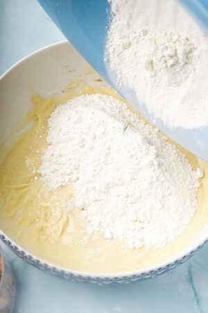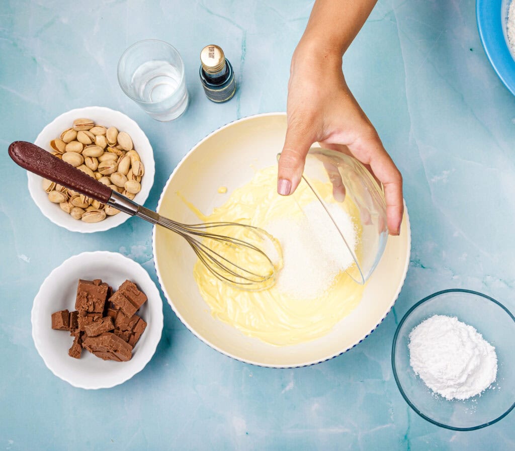 Slowly add the salt and flour, mixing it on low-medium speed.