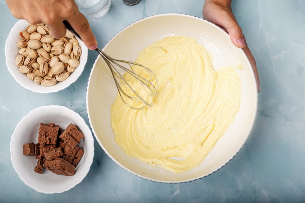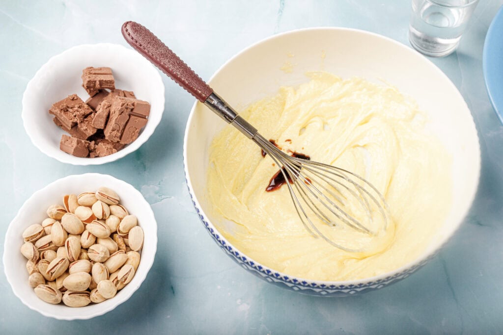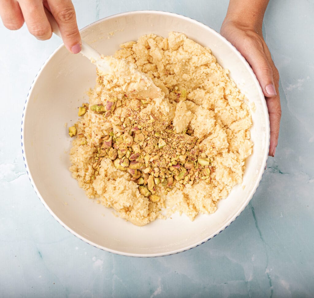 - Fold in ½ cup of the chopped pistachios, reserving the rest for garnish.