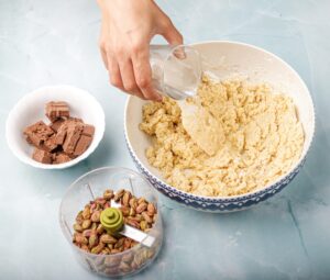The cookie dough may be slightly crumbly, if it is then knead the dough slightly with your hands until it just begins to come together.