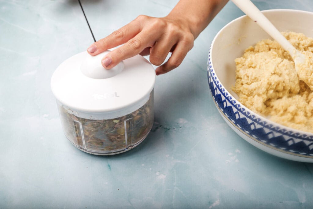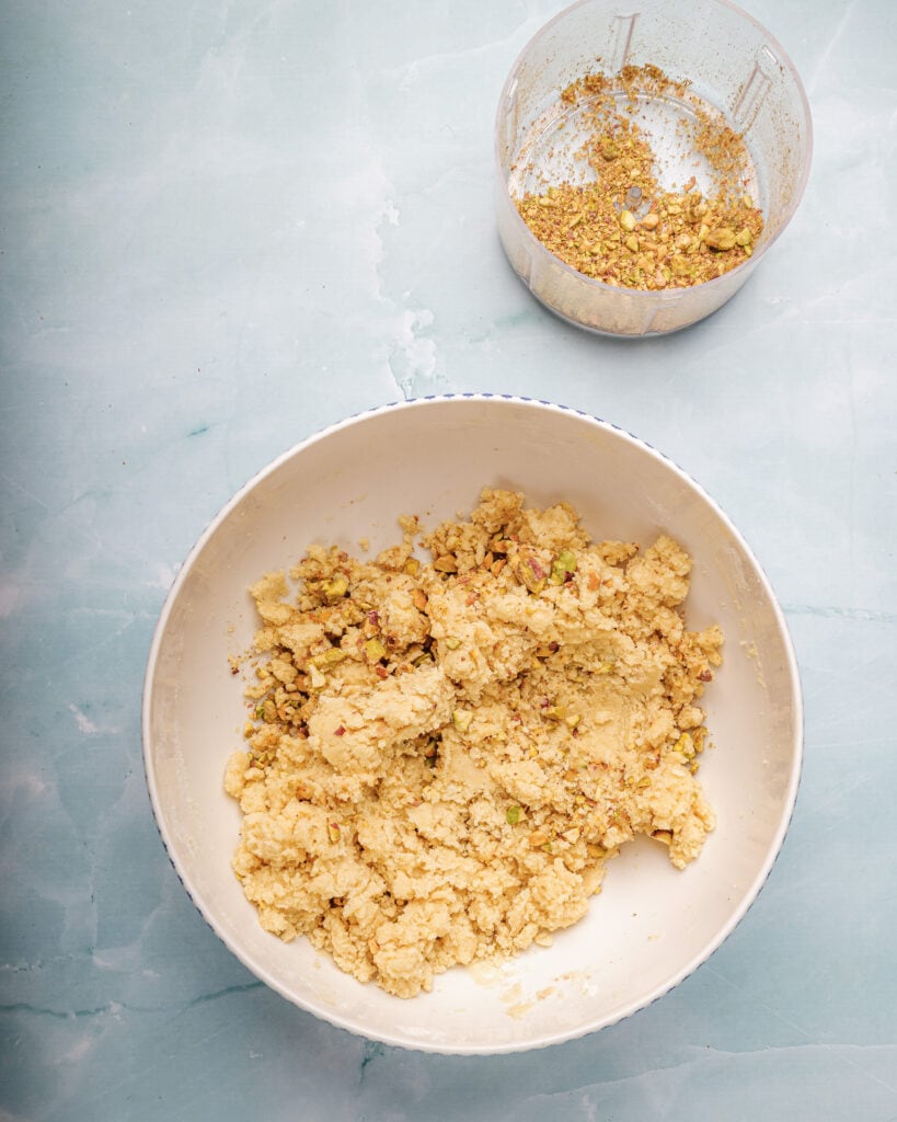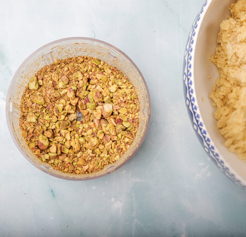 Begin prep by shelling the pistachios and chopping them very finely. You don’t want them to turn into powder, but you do want them ground up quite well.