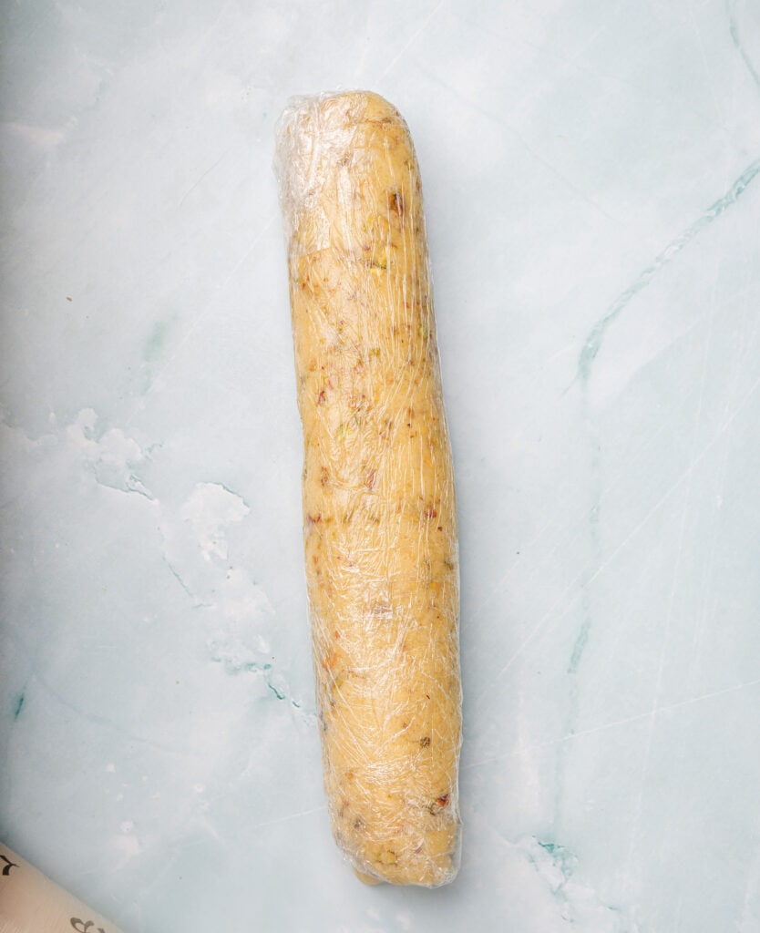 Wrap it tightly in the plastic wrap and roll it so that it gets packed together and so that its shape is smooth. Place it in the fridge for at least 2 hours or overnight.