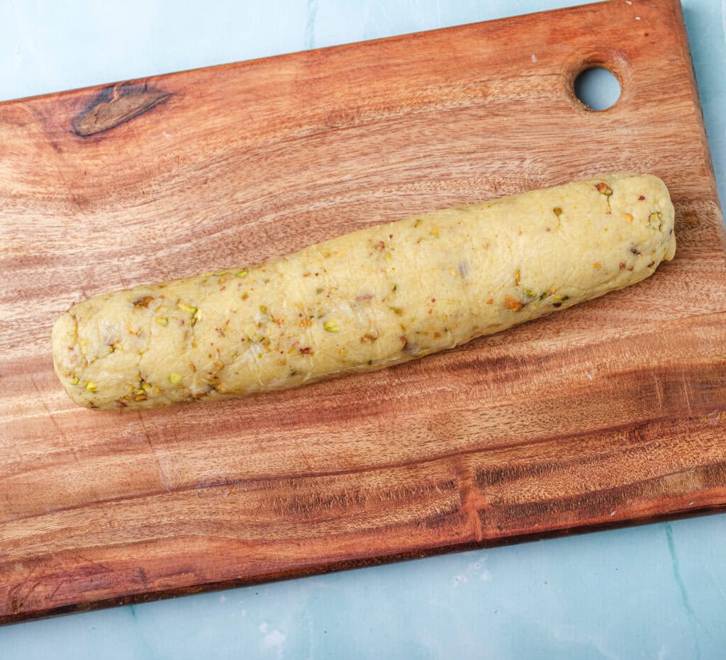- Wrap the dough log up in the plastic and shape it into a tight cylinder about 8-9 inches long.