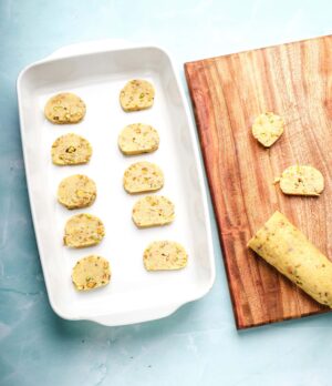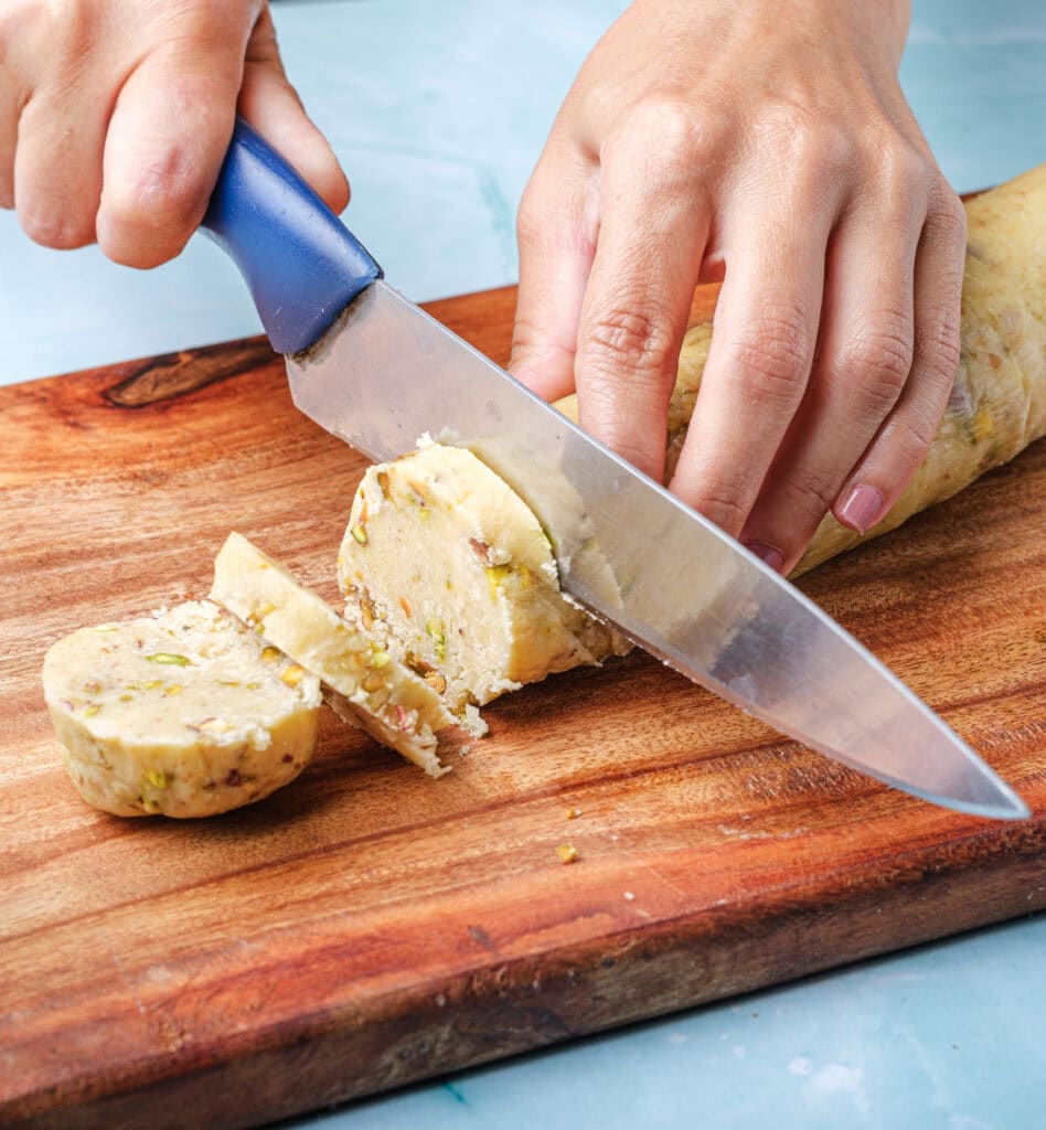 If you don’t chill the shortbread dough before slicing and baking, your dough will crumble apart into pieces. You should slice the cold dough then bake it immediately.