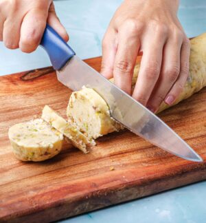 - Unwrap the dough from the plastic and slice it into ¼ inch circles with a sharp knife.