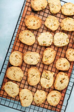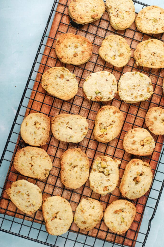 - Place the cookies on the prepared baking sheet and bake them in the oven for about 20-25 minutes or until the cookies just begin to get golden on the edges. You don’t want them to get brown on top. If the pistachios look toasted, then they are done!