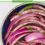 This recipe for sumac onions is the best condiment for many Arabic meat dishes (think kebabs and other grilled meats), and salads. They are the perfect salad onions for your salad of choice! It is a lovely addition to any charcuterie board or mezze platter, and is even a great topping for hummus or baba ganoush.