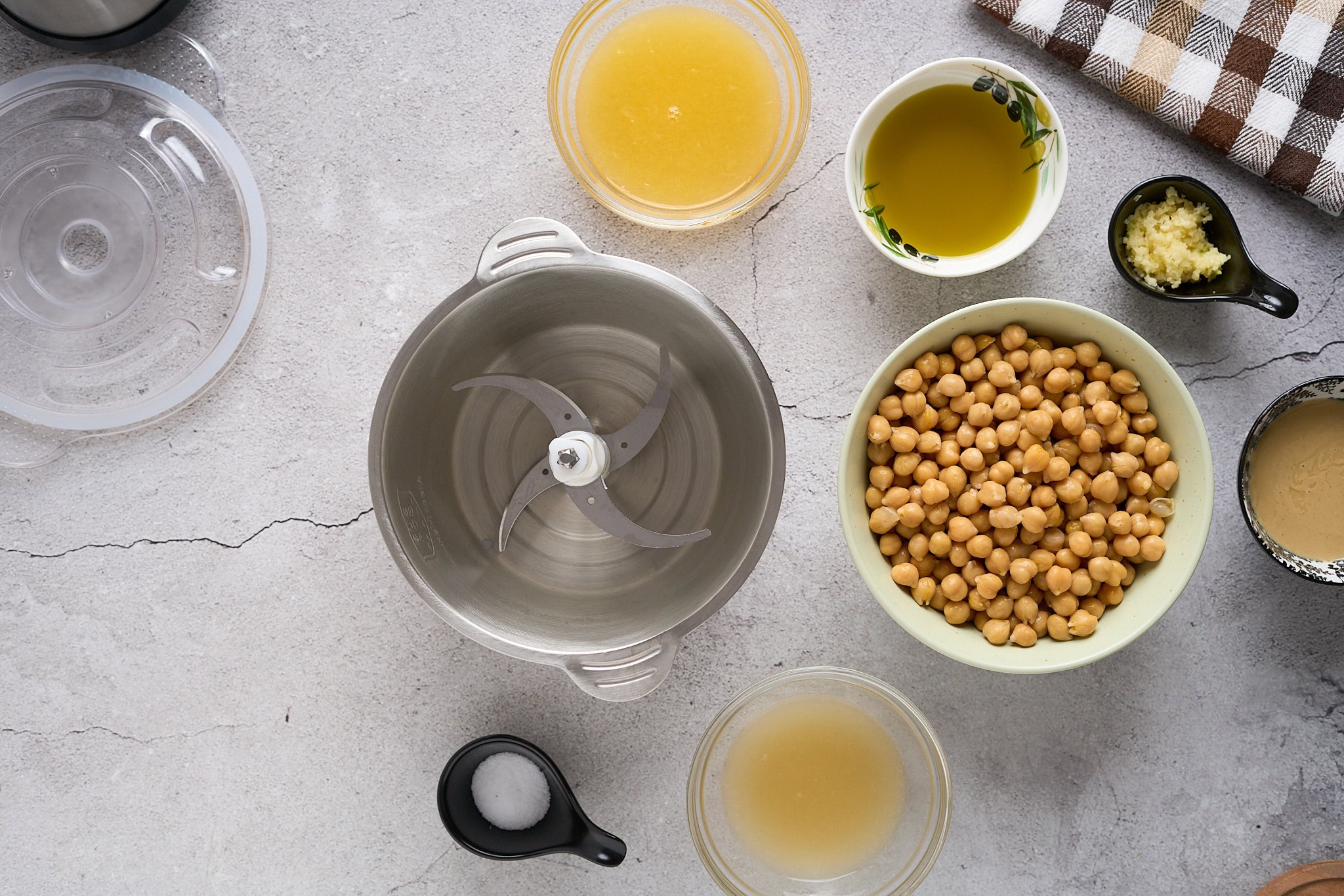 Add the lemon juice, salt, and tahini into the food processor. Put the lid on and turn the food processor on.
