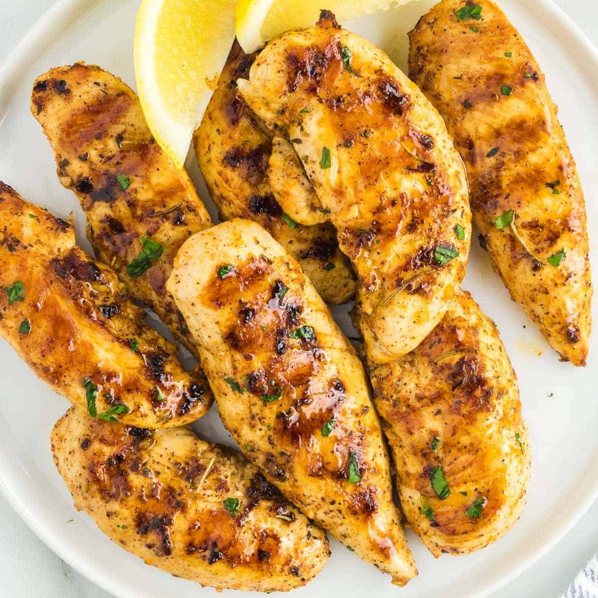 These chicken tenders aren’t just straight from the kid’s menu though. They’re marinated in garlic, lemon, olive oil, pepper, Italian seasoning, and paprika — giving them a complex, zesty flavor.