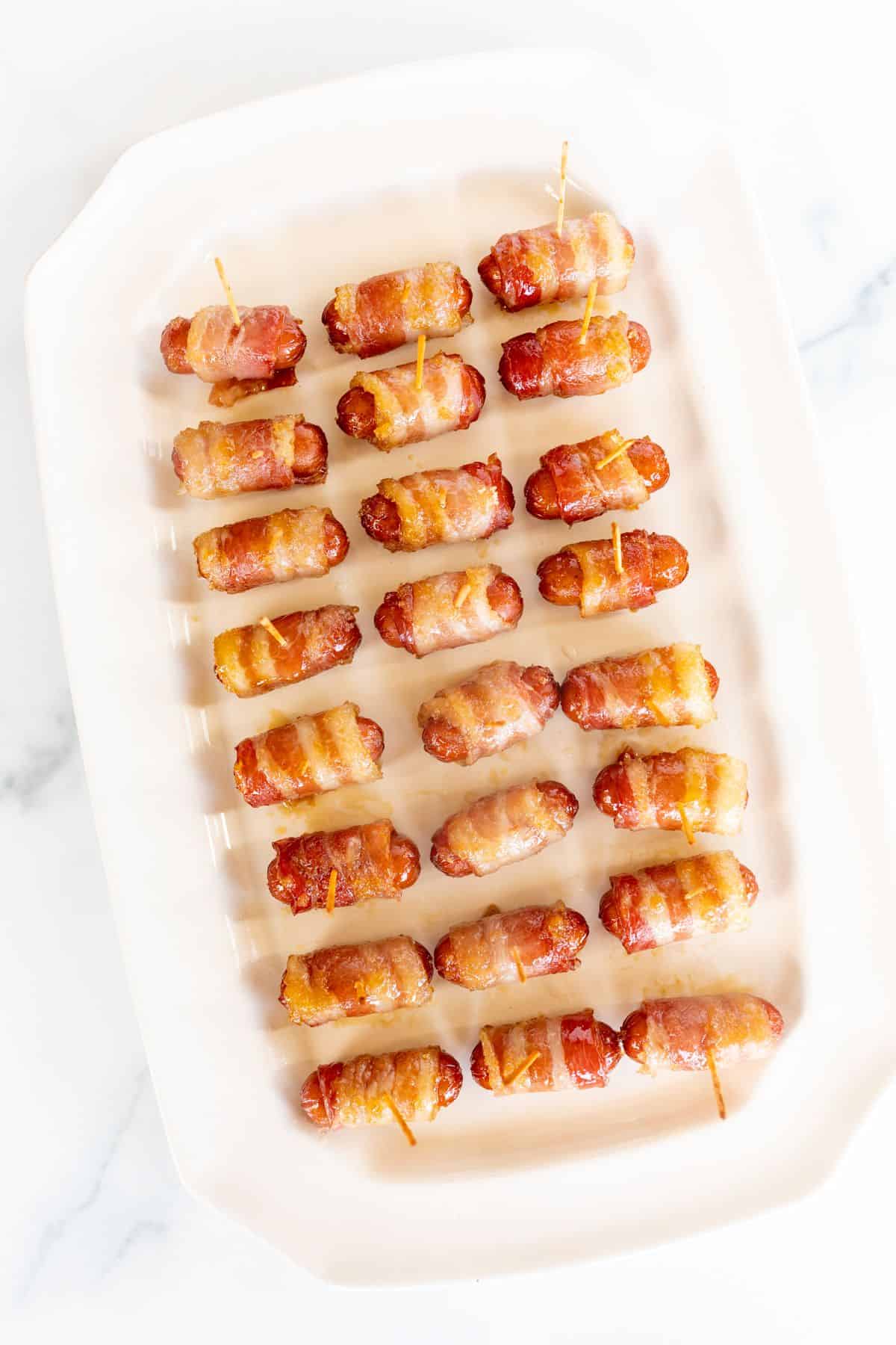 All you need to do to make them is wrap your sausages in bacon, secure them with a toothpick, and coat them in brown sugar. Then, pop them in the oven for around thirty minutes!