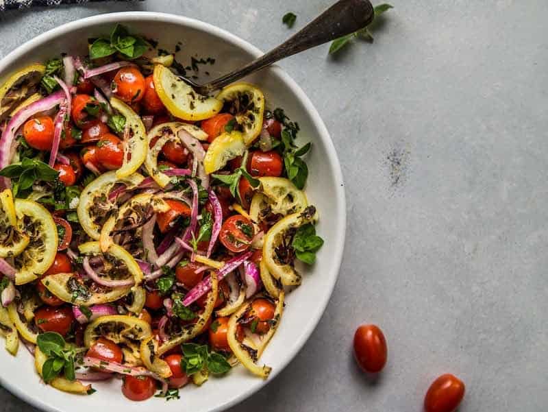 Combining the cooked lemon slices with fresh cherry tomatoes, parsley, mint, red onions, and red wine vinegar leads to a light and bright side salad that is the perfect accompaniment to the heavier mac and cheese dish.