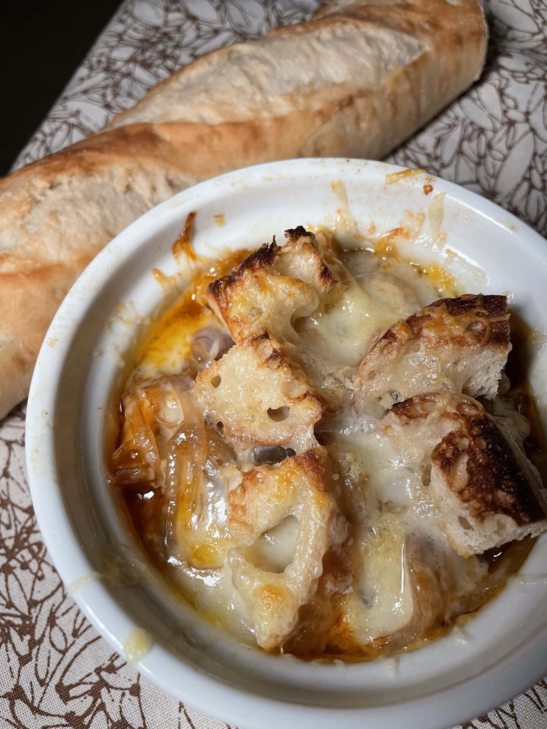 The crusty baguette slices absorb the rich broth without becoming too soggy, offering a pleasant textural contrast to the tender onions.