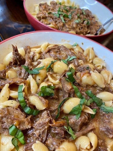 Once it’s thoroughly cooked, strain the cooking liquid out, and add in a cornstarch slurry while heating to make your gravy. Then, get ready to eat!