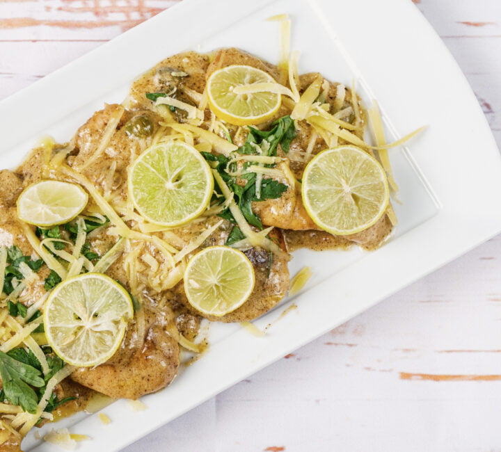 This chicken piccata is crunchy, chewy, and delightful breaded chicken breasts swimming in a tangy, satisfying lemon and butter sauce.